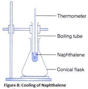 - The boiling tube in section A is removed from the water bath. The outer surface of the boiling tube is dried and immediately it is put in a conical flask, as shown in Figure B. The naphthalene is stirred continuously.