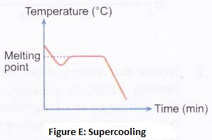 (e) From point C to point D, the particles in liquid naphthalene absorb heat energy and move faster. The temperature increases from point C to point D. - A graph of temperature against time is plotted for the cooling of naphthalene, as shown in Figure D.
