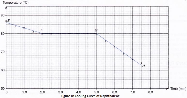 (c) At point F, liquid naphthalene begins to freeze. During the freezing process, the temperature of naphthalene remains constant because the heat loss to the surroundings is exactly balanced by the heat energy liberated as the particles attract one another to form a solid. At this temperature, both solid and liquid are present.