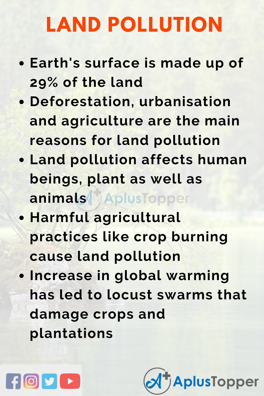 - Deforestation, urbanisation and agriculture are the main reasons for land pollution