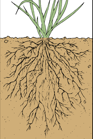 Fibrous roots, which grow from the base of the stem have a bushy appearance. These roots are thin and almost equal in size. Grass, maize, wheat, onion, sugarcane, and rice are examples of plants with fibrous roots.