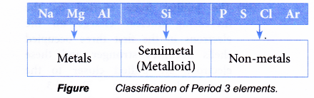 Based on the above electrical conductivities, the elements in Period 3 can be classified into metals, semimetal (or metalloid) and non-metals as shown in Figure.