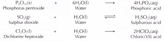 - Phosphorus pentoxide, sulphur dioxide and dichlorine heptoxide dissolve in water to form acidic solutions. Hence, phosphorus, sulphur and chlorine exhibit non-metallic properties.