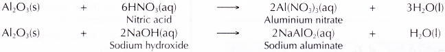 - Aluminium oxide can dissolve in both dilute nitric acid and sodium hydroxide solution. Hence, aluminium oxide exhibits both basic and acidic properties, that is, amphoteric properties.
