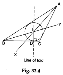 Step 5: Fold the paper along the line that passes through the point I and cuts the line BC in such a way that one part of the line BC falls over the other part. Make a crease and unfold the paper. Mark a point D where the line of fold cuts the line BC. Join ID as shown in Figure 32.4.