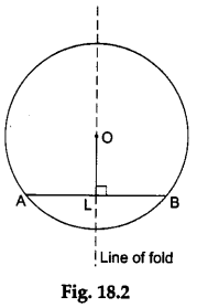 Form a crease and unfold the tracing paper. Draw a line OL over the crease such that the point L lies on the chord AB, as shown in Figure 18.2. Then, OL is the perpendicular drawn from the centre of the circle to the chord AB.