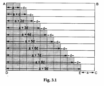 = a+(a + d)+(a + 2d) +…+ (a + 9d). … (iii) - Area of the portion of the rectangle ABCD covered by the coloured strips = ½ (area of the rectangle ABCD).