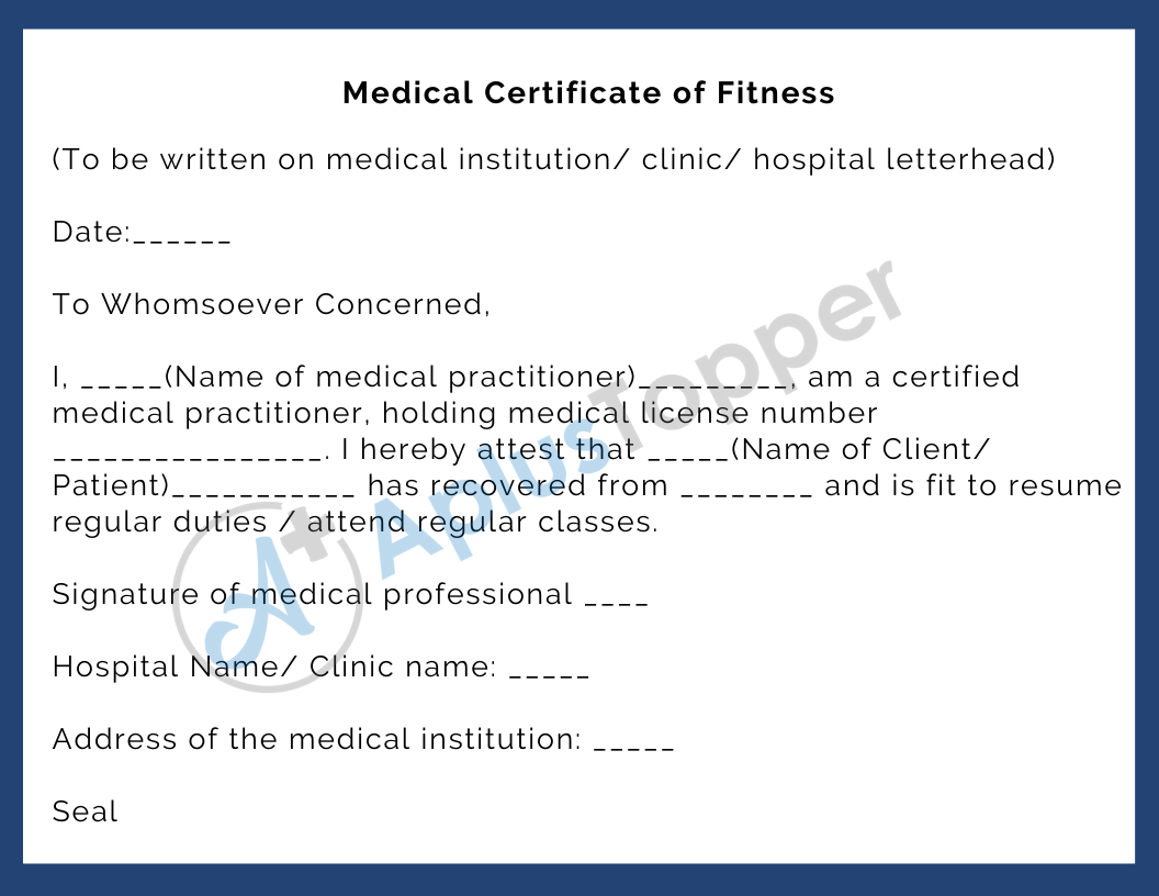 | Medical Certificate of Fitness (To be written on medical institution/ clinic/ hospital letterhead) Date:______ To Whomsoever Concerned, I, _____(Name of medical practitioner)_________, am a certified medical practitioner, holding medical license number ________________. I hereby attest that _____(Name of Client/ Patient)___________ has recovered from ________ and is fit to resume regular duties / attend regular classes. Signature of medical professional ____ Hospital Name/ Clinic name: _____ Address of the medical institution: _____ Seal |