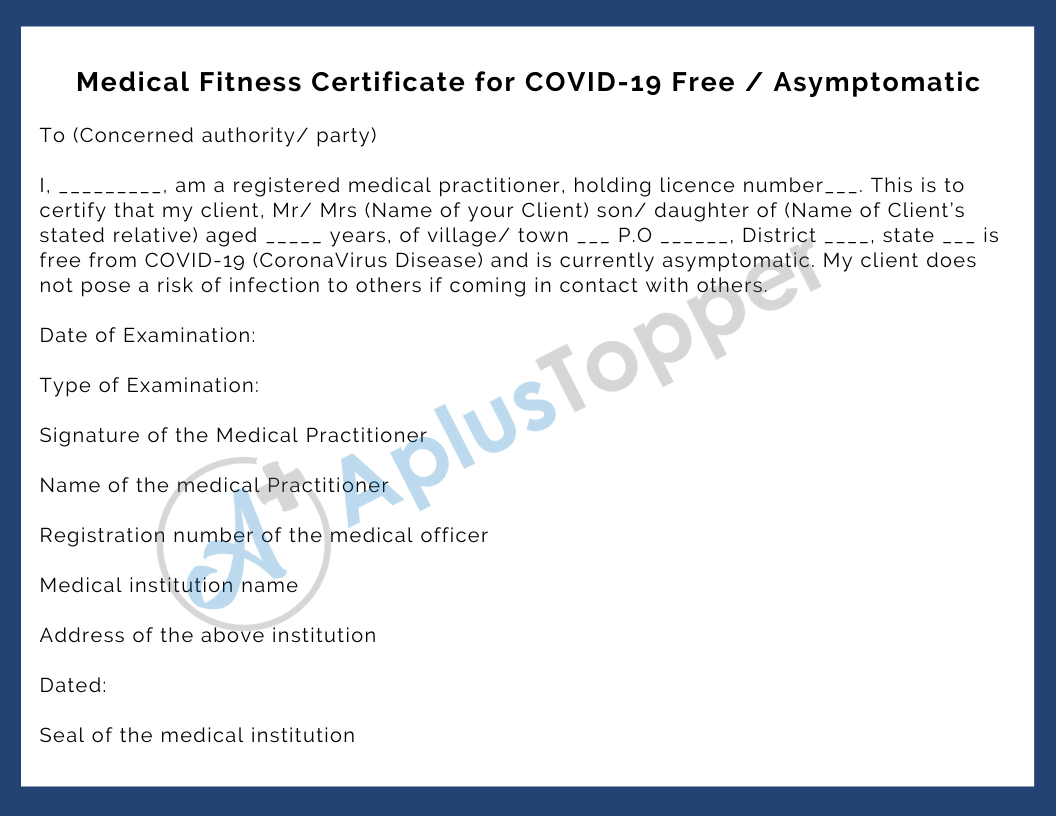 | Medical Fitness Certificate To (Concerned authority)_____ I, _________, am a registered medical practitioner, holding licence number___. This is to certify that my client, Mr/ Mrs (Name of your Client) son/ daughter of (Name of Client’s stated relative) aged _____ years, of village/ town ___ P.O ______, District ____, state ___ is free from COVID-19 (CoronaVirus Disease) and is currently asymptomatic. My client does not pose a risk of infection to others if coming in contact with others. Date of Examination: Type of Examination: Signature of the Medical Practitioner Name of the medical Practitioner Registration number of the medical officer Medical institution name Address of the above institution Dated: Seal of the medical institution |