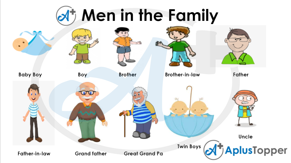 Men in the Family Vocabulary: Learn the list of men in the family vocabulary in English with images. There are different relations in the family-like father, son, baby boy, grandfather, great grandfather, uncle, etc. It is very important for the kids to the relationship names. Learn the Men in the Family Vocabulay from here. Children can find the list of Male Family Members to understand the relationships deeply.