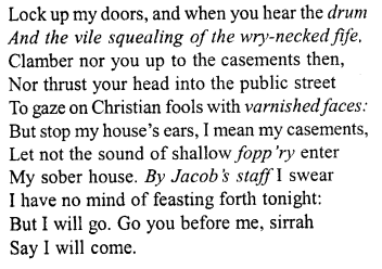The above mentioned passage shows that Shylock is a strictly religious Jew. He is shocked to hear that there will be masques in the street. He objects to such profane shows. Moreover, he does not want his young daughter to watch such shows of dance and merriment. He does not want his strictly religious house to be profaned with any sound of loose enjoyment.