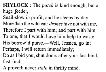 SHYLOCK : The man is kind enough, but a huge eater; Snail-slow in worth, and he sleeps by day More than the wild-cat does; drones don’t live with me, So I’m parting with him; and send with him To one that I want him help to waste His borrowed purse. Well, Jessica, go in; Perhaps I’ll return immediately: Do as I tell you, shut doors after you:” Fast bind, fast find,” A proverb that’s never forgotten in a successful Exit.