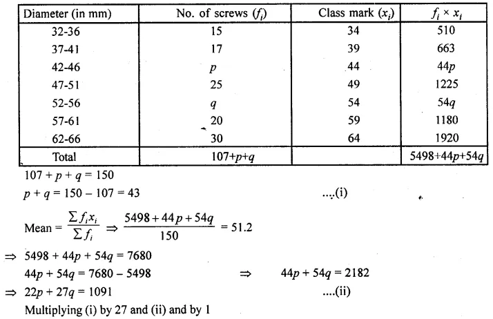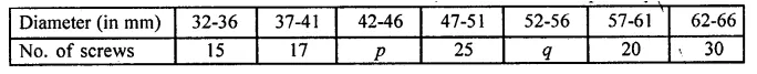 The measures of the diameter of the heads of 150 screw is given in the following table. If the mean diameter of the heads of the screws is 51.2 mm, find the values of p and q