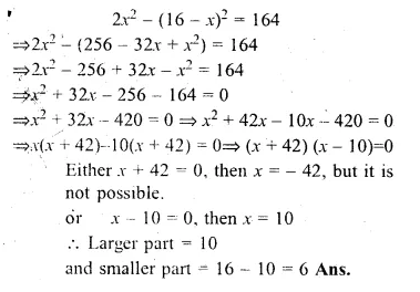 Divide 16 into two parts such that the twice the square of the larger part exceeds the square of the smaller part by 164.