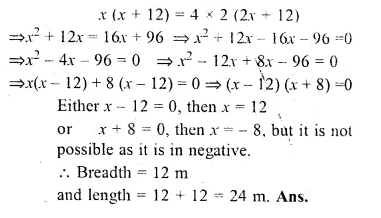The length of a rectangular garden is 12 m more than its breadth. The numerical value of its area is equal to 4 times the numerical value of its perimeter. Find the dimensions of the garden.