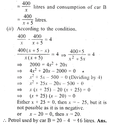 (ii) If car A uses 4 litres of petrol more than car B in covering 400 km. write down an equation, in A and solve it to determine the number of litres of petrol used by car B for the journey.