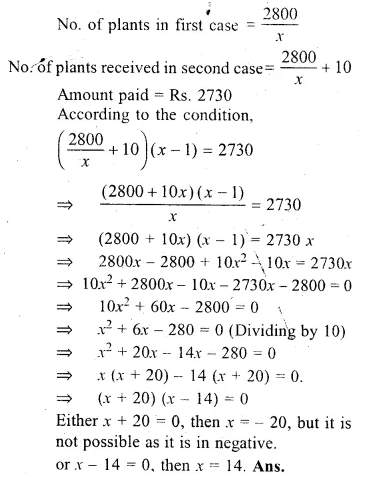 A man spent Rs. 2800 on buying a number of plants priced at Rs x each. Because of the number involved, the supplier reduced the price of each plant by Rupee 1.The man finally paid Rs. 2730 and received 10 more plants. Find x.