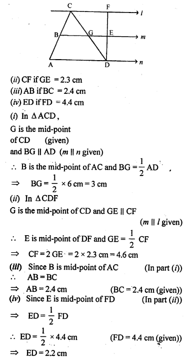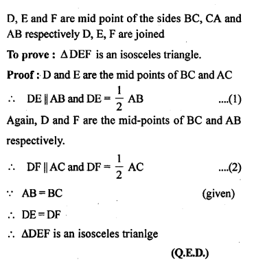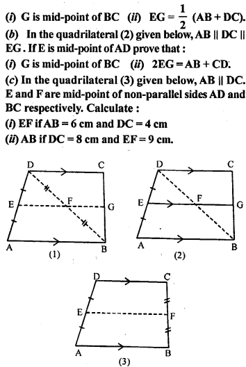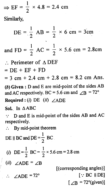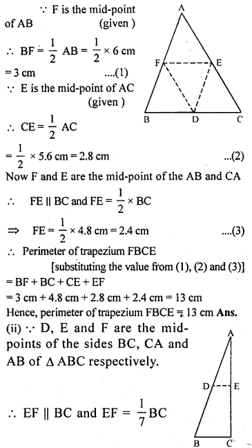 (a) In the figure (1) given below, D, E and F are mid-points of the sides BC, CA and AB respectively of ∆ ABC. If AB = 6 cm, BC = 4.8 cm and CA= 5.6 cm, find the perimeter of (i) the trapezium FBCE (ii) the triangle DEF.
