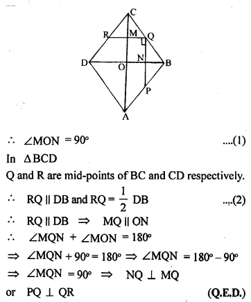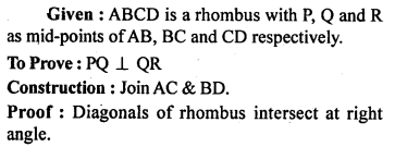 ABCD is a rhombus with P, Q and R as midpoints of AB, BC and CD respectively. Prove that PQ ⊥ QR.