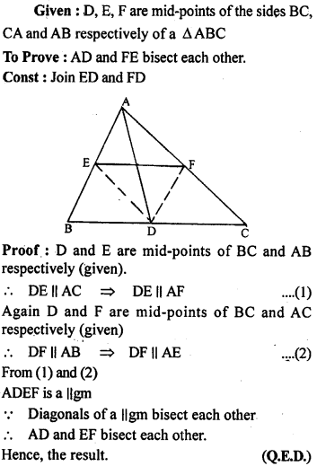 If D, E, F are mid-points of the sides BC, CA and AB respectively of a ∆ ABC, Prove that AD and FE bisect each other.