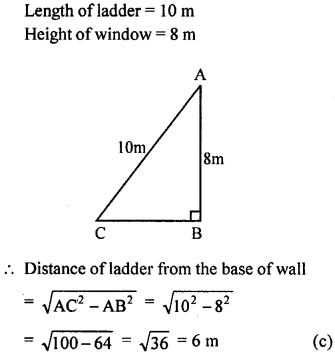 If a ladder 10 m long reaches a window 8 m above the ground, then the distance of the foot of the ladder from the base of the wall is