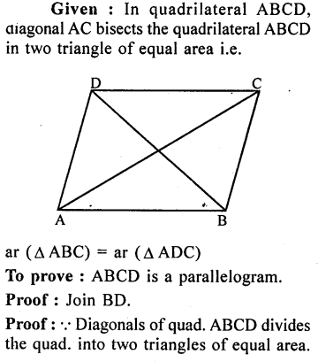 If each diagonal of a quadrilateral’ divides it into two triangles of equal areas, then prove that the quadrilateral is a parallelogram.