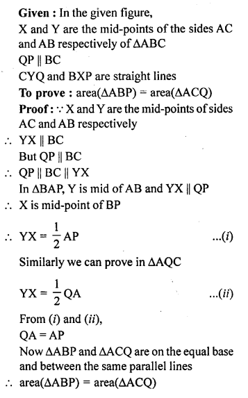 In the given figure, X and Y are mid-points of the sides AC and AB respectively of ∆ABC. QP || BC and CYQ and BXP are straight lines. Prove that area of ∆ABP = area of ∆ACQ.