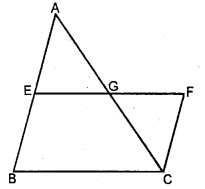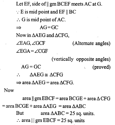 In the adjoining figure, E is mid-point of the side AB of a triangle ABC and EBCF is a parallelogram. If the area of ∆ ABC is 25 sq. units, find the area of || gm EBCF.
