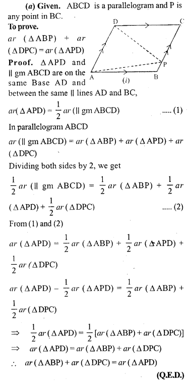 (a) In the figure (1) given below, ABCD is a parallelogram and P is any point in BC. Prove that: Area of ∆ABP + area of ∆DPC = Area of ∆APD.