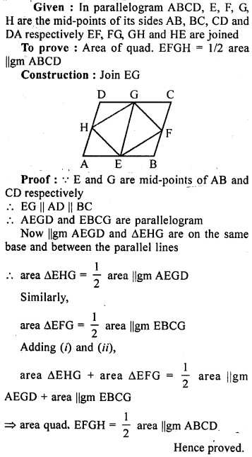 If E, F, G and H are mid-points of the sides AB, BC, CD and DA respectively of a parallelogram ABCD, prove that area of quad. EFGH = 1/2 area of || gm ABCD.