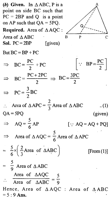 (b) In the figure (2) given below, P is a point on the sidoBC of ∆ABC such that PC = 2BP, and Q is a point on AP such that QA = 5 PQ, find area of ∆AQC : area of ∆ABC.