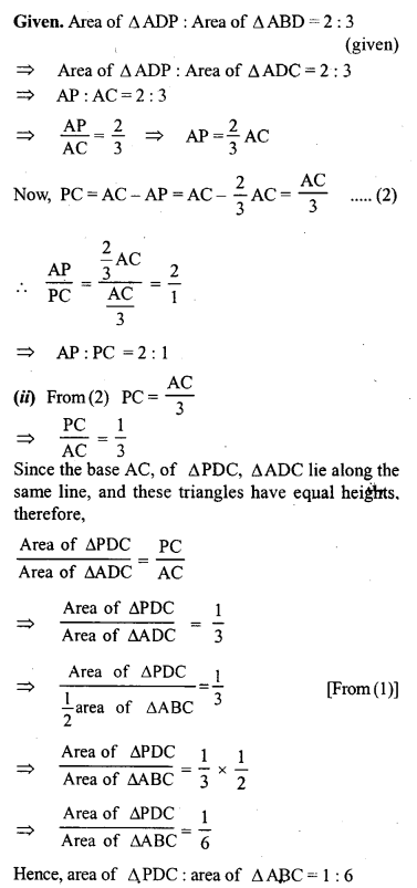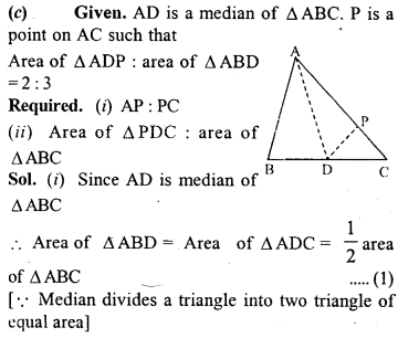 (c) In the figure (3) given below, AD is a median of ∆ABC and P is a point in AC such that area of ∆ADP : area of AABD = 2:3. Find