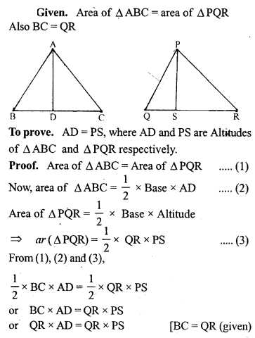 Prove that two triangles having equal areas and having one side of one of the triangles equal to one side of the other, have their corresponding altitudes equal.