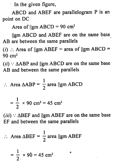 In the adjoining figure, ABCD and ABEF are parallelogram and P is any point on DC. If area of || gm ABCD = 90 cm2, find:
