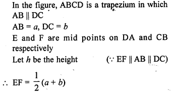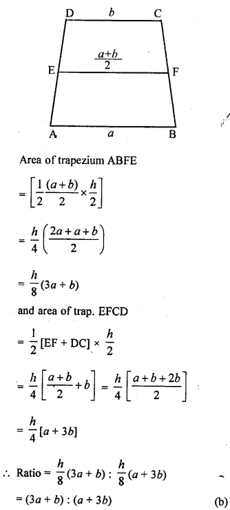 In the given figure, ABCD is a trapezium with parallel sides AB = a cm and DC = b cm. E and F are mid-points of the non parallel sides. The ratio of area of ABEF and area of EFCD is