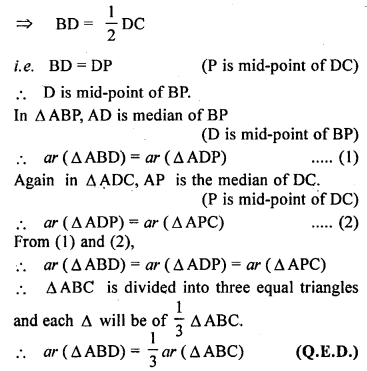 (b) In the figure (2) given below, D is mid-point of the side AB of ∆ABC. P is any point on BC, CQ is drawn parallel to PD to meet AB in Q. Show that area of ∆BPQ = \(\frac { 1 }{ 2 }\) area of ∆ABC.