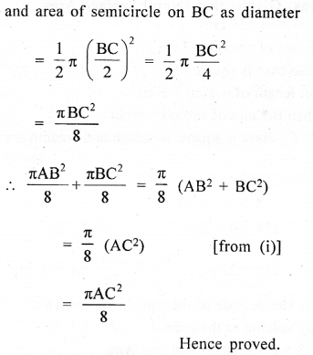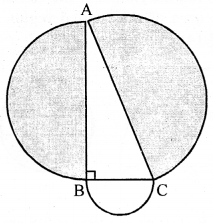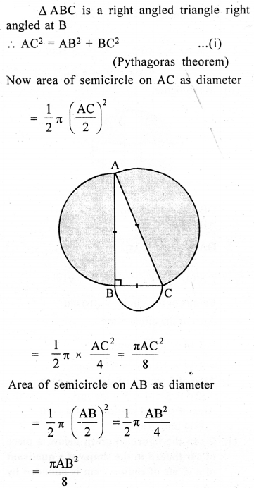 In the adjoining figure, ABC is a right angled triangle right angled at B. Semicircle are drawn on AB, BC and CA as diameter. Show that the sum of areas of semi circles drawn on AB and BC as diameter is equal to the area of the semicircle drawn on CA as diameter.
