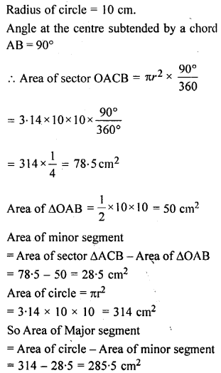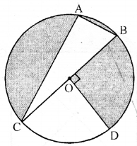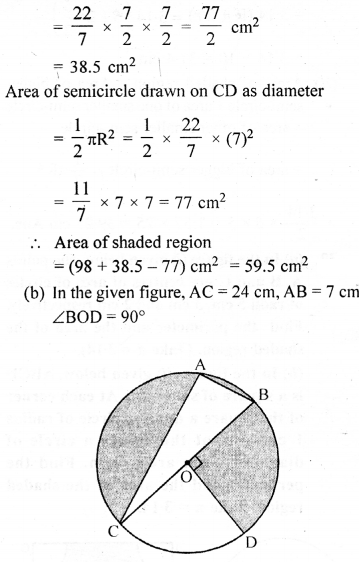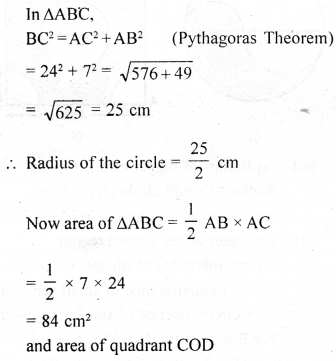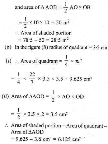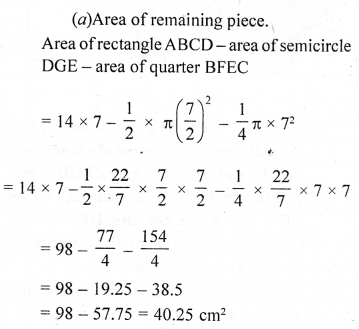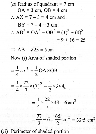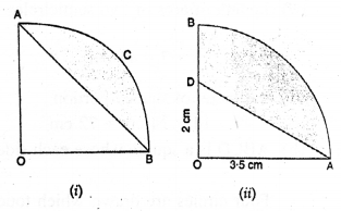 (a) In the figure (i) given below, a piece of cardboard in the shape of a quadrant of a circle of radius 7 cm is bounded by perpendicular radii OX and OY. Points A and B lie on OX and OY respectively such that OA = 3 cm and OB = 4 cm. The triangular part OAB is removed. Calculate the area and the perimeter of the remaining piece.