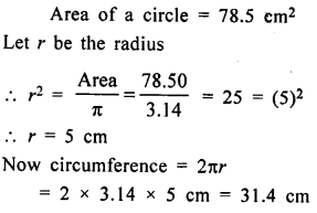 If the area of a circle is 78.5 cm2, find its circumference. (Take π = 3.14)