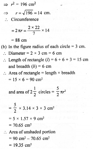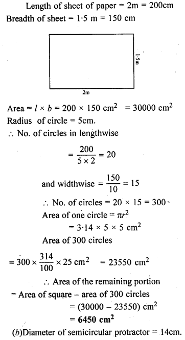 (a) From a sheet of paper of dimensions = 2m x 1.5m, how many circles can you cut of radius 5cm. Also find the area of the paper wasted. Take π = 3.14.
