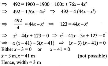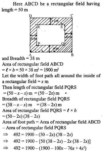 A foot path of uniform width runs all around the inside of a rectangular field 50 m long and 38m wide. If the area of the path is 492 m². Find its width.