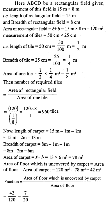 A rectangular floor which measures 15 m x 8 m is to be laid with tiles measuring 50 cm x 25 cm find the number of tiles required further, if a carpet is laid on the floor so that a space of 1 m exists between its edges and the edges of the floor, what fraction of the floor is uncovered?