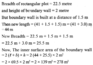 A rectangular plot of land measures 41 metres in length and 22.5 metres in width. A boundary wall 2 metres high is built all around the plot at a distance of 1.5 m from the plot. Find the inner surface area of the boundary wall.
