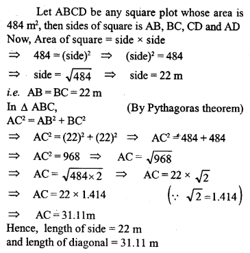 The area of a square plot is 484 mV Find the length of its one side and the length of its one diagonal.