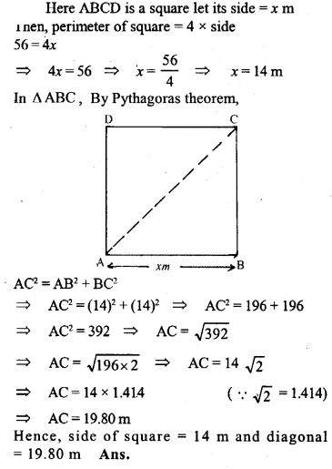 A square has the perimeter 56 m. Find its area and the length of one diagonal correct upto two decimal places.