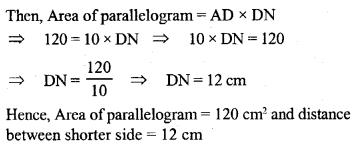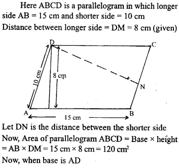Two adjacent sides of a parallelogram are: 15 cm and 10 cm. If the distance between the longer sides is 8 cm, find the area of the parallelogram. Also find the distance between shorter sides.