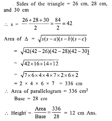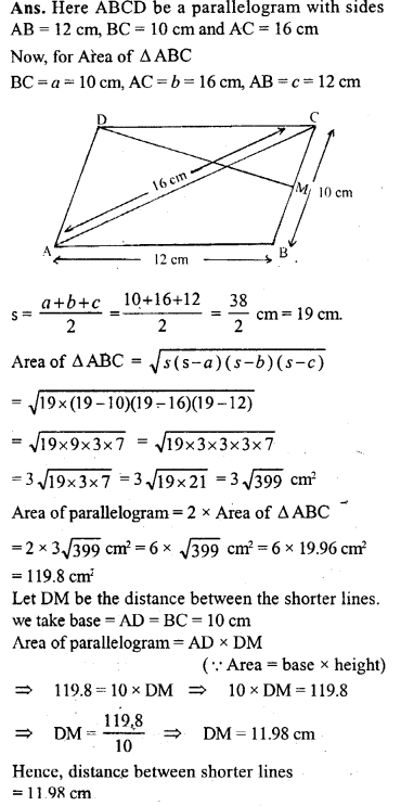 ABCD is a parallelogram with sides AB = 12 cm, BC = 10 cm and diagonal AC = 16 cm. Find the area of the parallelogram. Also find the distance between its shorter sides.