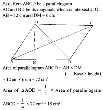 Diagonals AC and BD of a parallelogram ABCD intersect at O. Given that AB = 12 cm and perpendicular distance between AB and DC is 6 cm. Calculate the area of the triangle AOD.