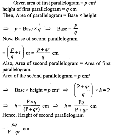 The area of a parallelogram is p cm2 and its height is q cm. A second parallelogram has equal area but its base is ‘r’ cm more than that of the first. Obtain an expression in terms of p, q and r for the height h of the second parallelogram.