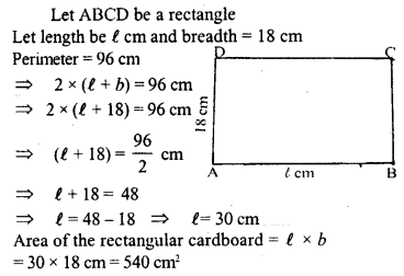 The perimeter of a rectangular cardboard is 96 cm ; If its breadth is 18 cm, find the length and the area of the cardboard.